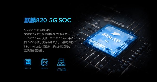 За производительность Honor X10 отвечает фирменный процессор Kirin 820. Чип поставляется со встроенным модемом для сети пятого поколения. Он может похвастаться поддержкой сразу 8 диапазонов 5G: 41, n78, n79, n1, n77, n38, n80 и n84. Его скорость загрузки достигает 1003 Мбит/с. SoC также работает в паре с оперативной памятью типа LPDDR4X и накопителем UFS 2.1.