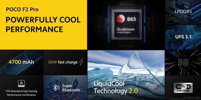 Под капотом Poco F2 Pro установлен топовый восьмиядерный процессор Qualcomm Snapdragon 865, который работает в паре с 5G-модемом и системой охлаждения LiquidCool Technology 2.0. Она, по заявлению компании, больше аналогичной в OnePlus 8 Pro и Galaxy S20 Plus и поэтому охлаждает смартфон лучше. Устройство поставляется с 6/8 ГБ ОЗУ типа LPDDR5 и 128/256 ГБ ПЗУ UFS 3.1.