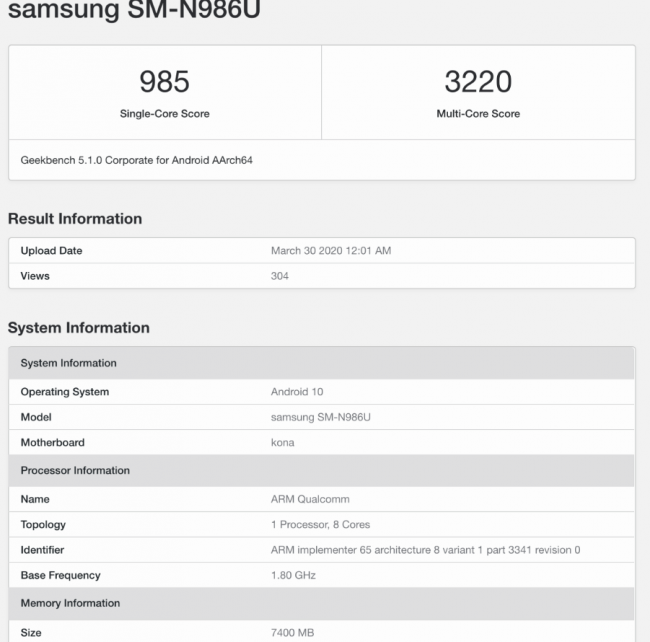 Тестовое устройство проходит с номером модели SM-N986U. Это, по слухам, Galaxy Note 20+ 5G. Аппарат работает под управлением операционной системы Android 10.