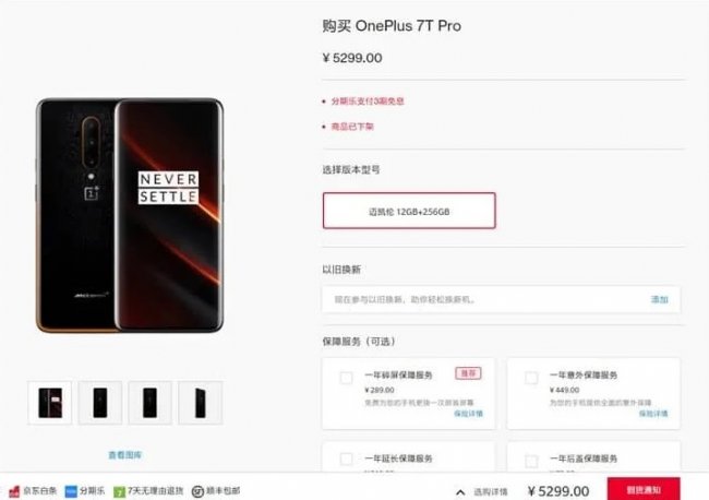 На официальном сайте OnePlus, а также на китайских площадках JD.com и Tmall смартфона больше нет в продаже. В наличии осталась только премиальная версия OnePlus 7T Pro McLaren Edition с 12/512 ГБ памяти.