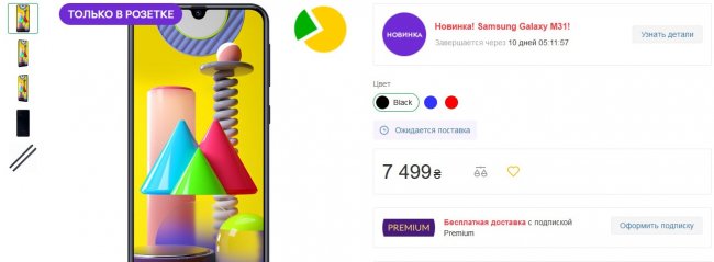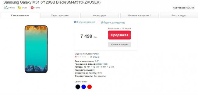 На Galaxy M31 также можно оформить предзаказ в Алло. Здесь указано, что смартфон поступит в продажу с 13 марта.