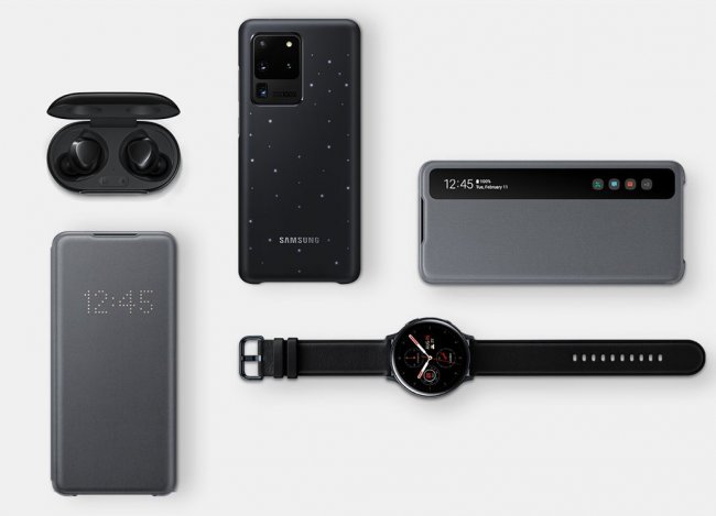 А это Galaxy S20 Ultra в защитных чехлах рядом с наушниками и «умными» часами.