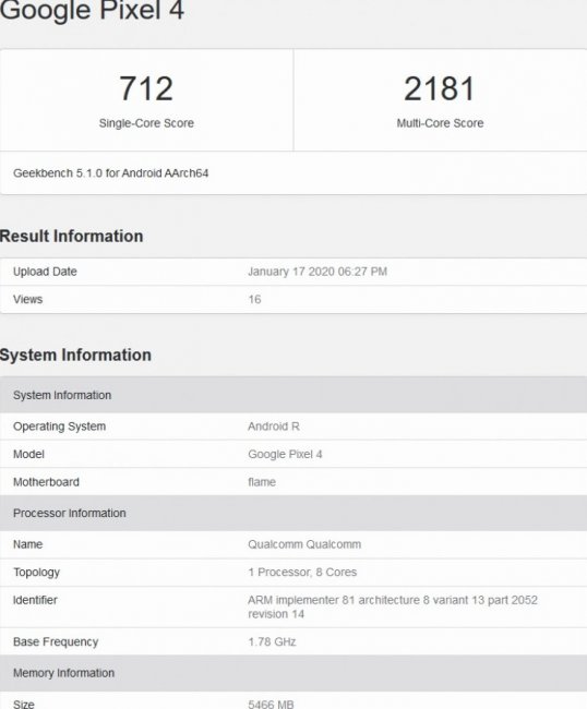 Тем не менее, в Geekbench прошел тестирование Google Pixel 4 с 6 ГБ оперативной памяти и Android R. В результате он набрал 712 баллов в одноядерном режиме и 2181 балл в многоядерном.