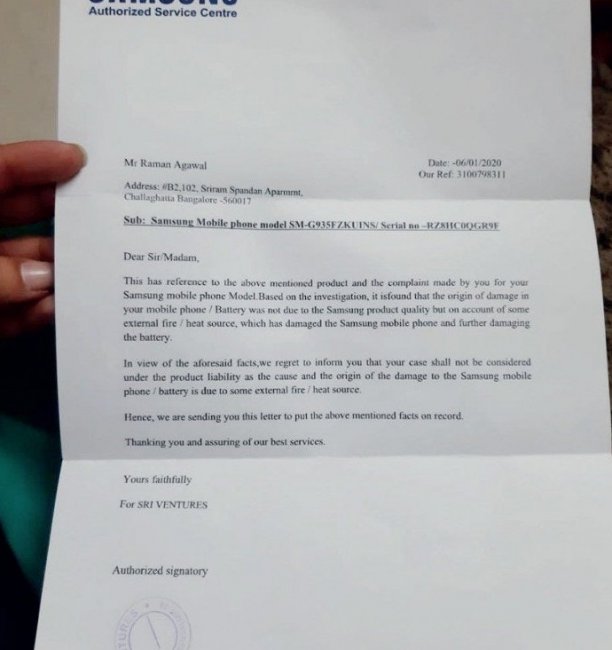 Сима после этого связалась с сервисным центром Samsung, однако там заявили, что инцидент связан с внешним температурным воздействием.