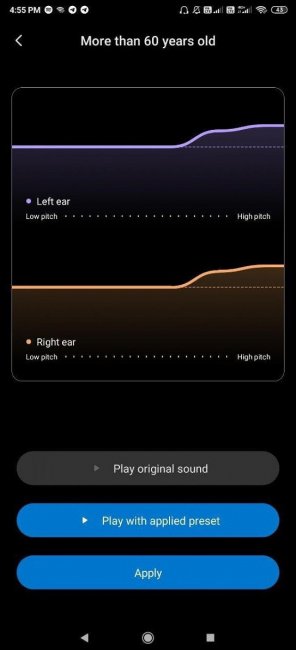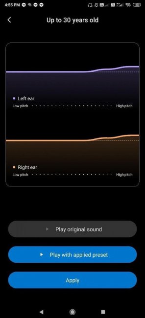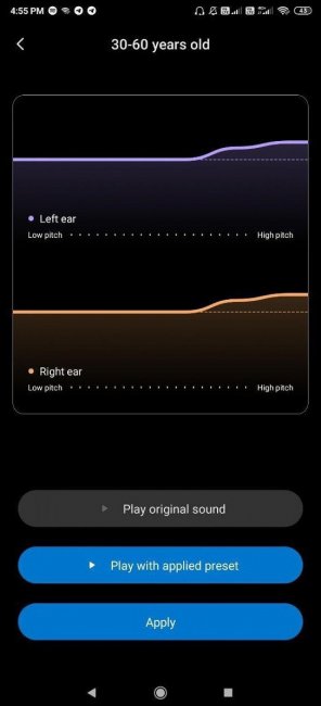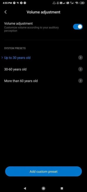 Кроме того, здесь есть настройки по возрастным группам: до 30 лет, 30–60 лет и более 60 лет. Пользователи смогут указать свой возраст и отрегулировать громкость звучания в общем либо для каждого наушника отдельно.