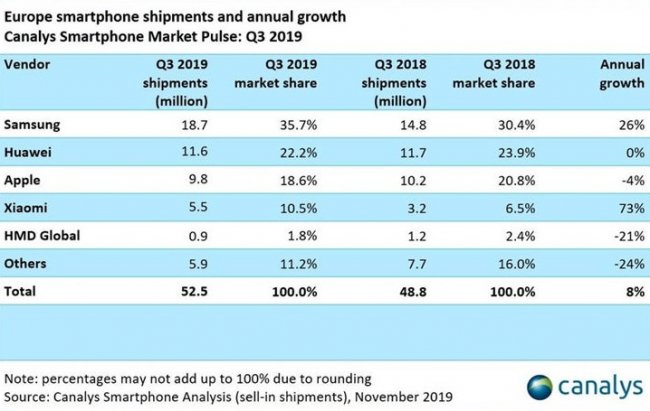 А вот Xiaomi добралась до четвертой строчки рейтинга. В третьем квартале компания отгрузила 5,5 млн смартфонов и сейчас занимает 10,5% европейского рынка.