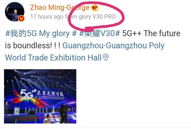 Жао Минг (Zhao Ming) побывал на конференции China Mobile Global Partners Conference 2019 и написал об этом пост в Weibo с хэштегом #Honor V30.