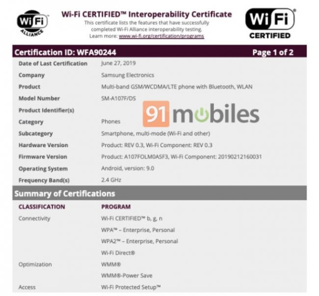 Galaxy A10s прошёл сертификацию с номером модели SM-A107F. В отчёте говорится, что аппарат получит поддержку Wi-Fi 2.4 ГГц, а также будет работать на операционной системе Android 9 Pie. Других подробностей сертификация не раскрыла, но благодаря предыдущим утечкам, известно, что у него будет 6.2-дюймовый дисплей и следующие габариты корпуса: 157×75.8 мм.