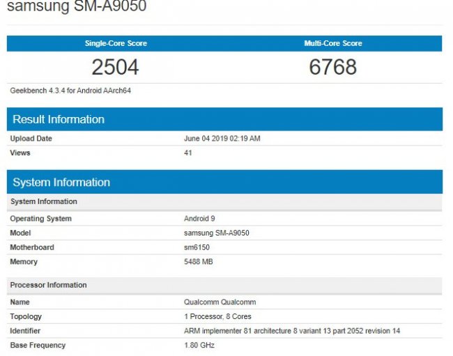 Устройство заметили в базе данных теста производительности Geekbench с номером SM-A9050. Новинка, согласно отчёту, имеет 6 ГБ оперативной памяти, предустановленную ОС Android 9 Pie и процессор sm6150. Это кодовое название чипа Snapdragon 675, но иногда под таким же номером проходят процессоры Snapdragon 730 и 730G. Судя по результатам теста, это именно 700-я серия.