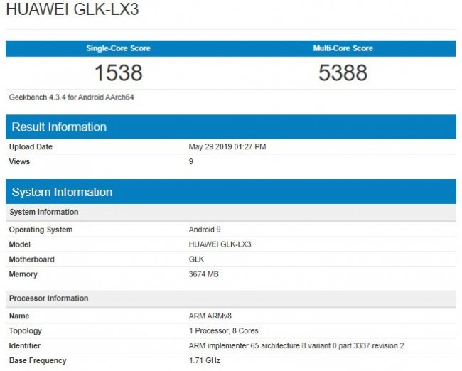 В базе данных теста производительности Geekbench заметили устройство компании с номером модели GLK-LX3. Как сообщают сразу несколько источников, речь идёт о Nova 5i. Смартфон, согласно результатам теста (1538 и 5388 баллов) работает на уже привычном 12-нанометровом процессоре Kirin 710 с тактовой частотой 1.71 ГГц. Хотя есть небольшая вероятность, что новинка всё-таки выйдет с новым чипом Kirin 720.