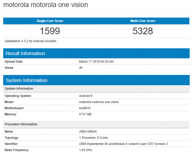 В базе данных теста заметили устройство Motorola с названием «One Vision». Предположительно, это кодовое имя смартфона Motorola P40. Новинка работает на 10-нанометровом процессоре Samsung Exynos 9610. У неё также установлено 6 ГБ оперативной памяти и версия ОС Android 9 Pie.