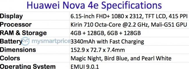 Смартфон должны оснастить аккумулятором на 3340 мАч с поддержкой быстрой зарядки. Он выйдет на рынок в трёх цветах: Magic Night, Bird Blue, Pearl White. Huawei Nova 4e также приписывают 32-мегапиксельную фронтальную камеру, тройную основную и сканер отпечатков пальцев на задней стороне.