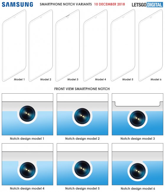 В середине этого года компания Samsung Display подала сразу шесть патентов в KIPO (Корейское ведомство интеллектуальной собственности), которые были утверждены 10 декабря. В патентах описываются разные вырезы для фронтальной камеры смартфона.