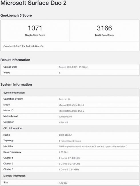 Согласно базе данных теста производительности, аппарат проходит с названием Microsoft Surface Duo 2. В отчёте говорится, что новинка получит процессор Qualcomm c четырьмя ядрами на 1.80 ГГц, тремя ядрами на 2.42 ГГц и одним производительным ядром с частотой 2.84 ГГц. Судя по исходному коду отчёта, чип будет поставляться с графикой Adreno 660. Следовательно, речь идёт о флагманском процессоре Snapdragon 888.