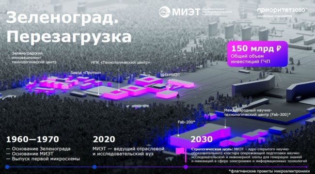 Перед электронной промышленностью России стоят амбициозные задачи: развитие научно-технического и кадрового потенциала и перевооружение производственных мощностей. И Зеленограду, как основной площадке развития отрасли, необходима перезагрузка. Для этого Минпромторг планирует инвестировать в Зеленоград более 150 млрд. рублей.