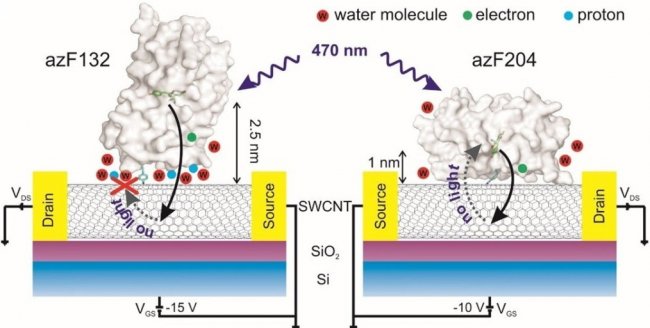 Схематичное изображение новых фотоэлектронных устройств на основе флуоресцентного белка и углеродной нанотрубки: оптоэлектронная память (слева) и фототранзистор (справа)