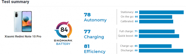 В Redmi Note 10 Pro установлена аккумуляторная батарея на 5020 мА*ч с быстрой 33-ваттной зарядкой. Её оценили на 77 пунктов. АКБ заряжается до 80% за 55 минут, а до 100% – за 1 час 32 минуты.