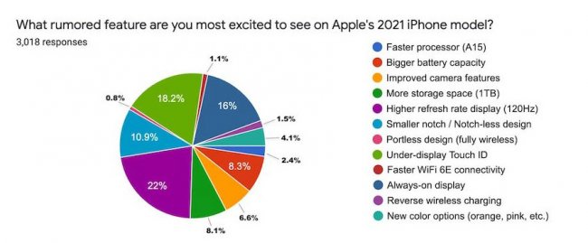 По слухам, 22% респондентов больше всего хотят видеть в линейке iPhone 13 дисплей с высокой частотой обновления 120 Гц. 18,2% респондентов надеются на наличие Touch ID под дисплеем, но могут быть разочарованы, поскольку, по последним данным, эта функция появится в новых моделях iPhone не раньше 2023 года. 16% ожидают появления "всегда включенного" дисплея, а 10,9% в восторге от перспективы уменьшения выреза.