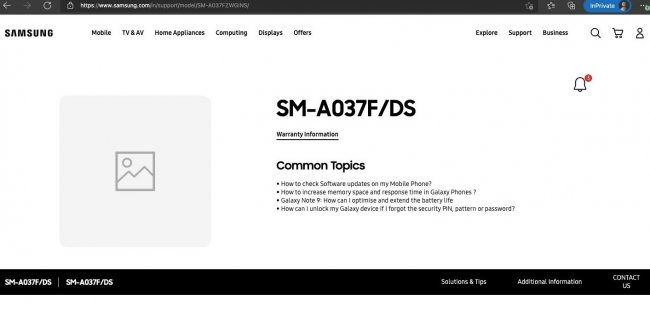 Аппарат с номером модели SM-A037F/DS появился на сайте индийской техподдержки Samsung. Следовательно, производитель уже готовит его к релизу. К сожалению, характеристик смартфона на сайте пока нет, но благодаря предыдущим утечкам они уже известны.