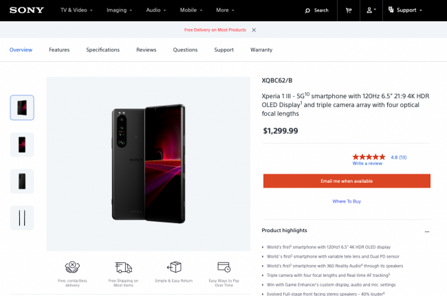 Аппарат появился на американском сайте производителя. Его уже можно предзаказать за $1299. Для сравнения, прошлогодняя модель Xperia 1 II стоила на $100 дешевле.