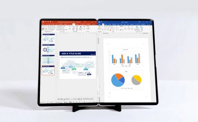 Кроме того, Samsung работает над складным ноутбуком. У него 17-дюймовая панель с соотношением сторон 4:3, которая складывается посередине.