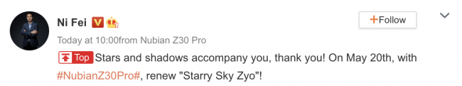 Глава подразделения ZTE Nubia объявил в социальной сети Weibo дату анонса нового флагманского смартфона Nubia Z30 Pro.