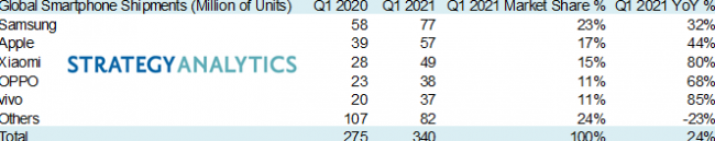 Компания Strategy Analytics провела исследование, подсчитала глобальные поставки смартфонов за первый квартал 2021 года и назвала пятерку самым популярных производителей за этот период.