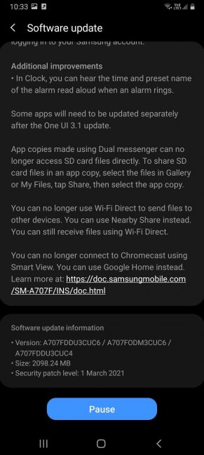 Речь идёт о модели Galaxy A70s. Прошивка для смартфона вышла с номером сборки A707FDDU3CUC6. Она весит 2 ГБ и включает в себя мартовский патч безопасности, а также все основные изменения Android 11 и новую оболочку One UI 3.1. Напомним, она может похвастаться обновлённым интерфейсом, расширенными настройками Dynamic Lock Screen и Always-On Display, новыми виджетами для экрана блокировки, новыми фирменными приложениями, улучшенным ассистентом Bixby, возможностью удалять GPS-данные с фотографий и т.д.