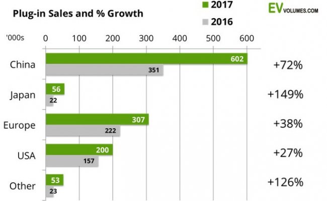 Мировым лидером по продажам электрокаров второй год подряд остается Китай. Рынок электромобилей там вырос на 72% – до 602 тыс. проданных авто. В Евросоюзе за 2017 год реализовано 307 тыс. электрокаров (+38%), а в США – около 200 тыс. (+27%).