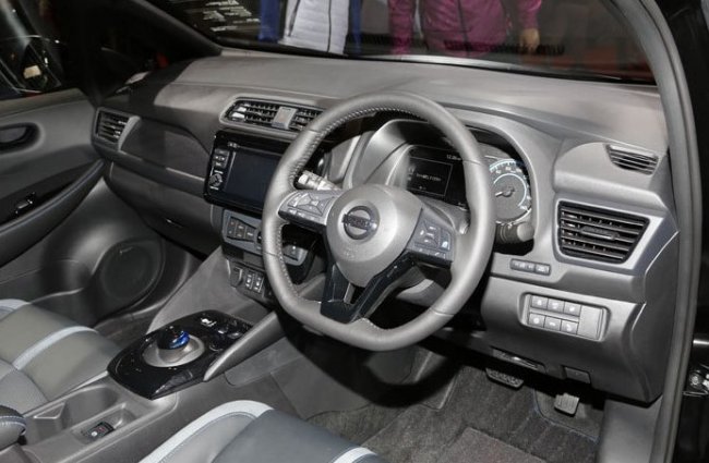 В новом электрокаре сиденья салона, центральный подлокотник и дверные карты отделаны картами с синими строчками. Они отлично сочетаются с подсветкой панели приборов и кнопок, выполненных в том же цвете. Автопроизводитель сохранил стилистику марки. Это чувствуется по дизайну салона и использовании определенных деталей. Например, руль оставили таким же, как у всех обновленных моделей Nissan.