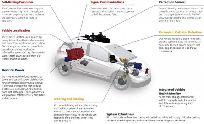 По словам компании, особое внимание уделяется безопасности транспортного средства. Так например, каждый беспилотный электромобиль будет оснащаться своеобразным «черным ящиком», фиксирующим всю окружающую информацию и действия системы автопилотирования. В подтверждение GM опубликовала свой первый 33-страничный отчет, посвященный вопросам безопасности прототипа, который она подала в Министерство транспорта США.
