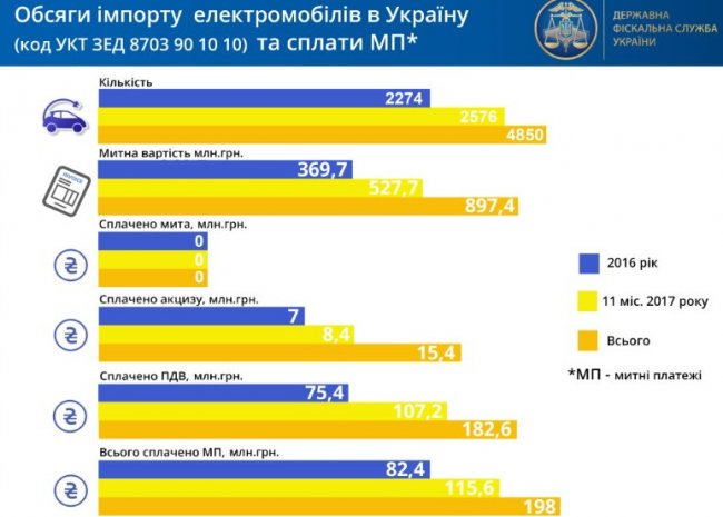 По данным ГФС, за этот период в украинскую казну было уплачено 115,6 млн гривен акциза и 82,37 млн гривен НДС. Согласно официальной информации, к настоящему моменту по украинским дорогам ездит более 4000 зарегистрированных электромобилей.