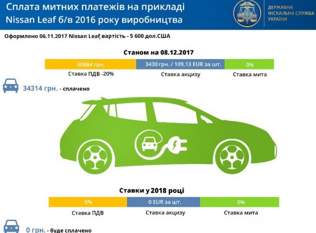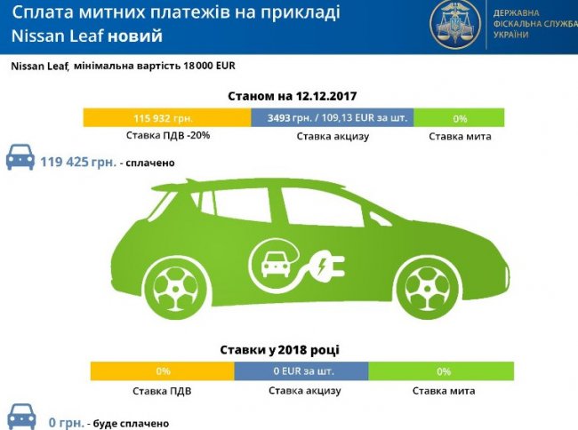 В Государственной Фискальной Службе подсчитали, что если сейчас при ввозе, например, недорогого б/у электромобиля Nissan Leaf 2016 года выпуска, оформленного ДФС по стоимости 5,6 тысяч долларов, импортером уплачивается более 34,3 тысяч гривен, то с нового года эта компания сэкономит более 20% средств за счет отсутствия таможенных платежей.