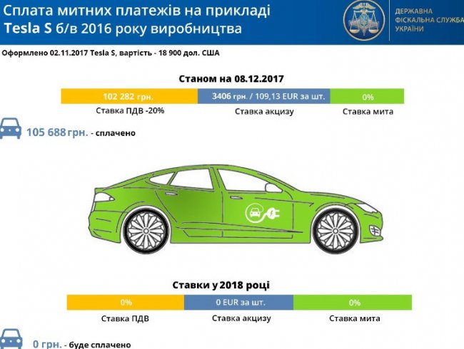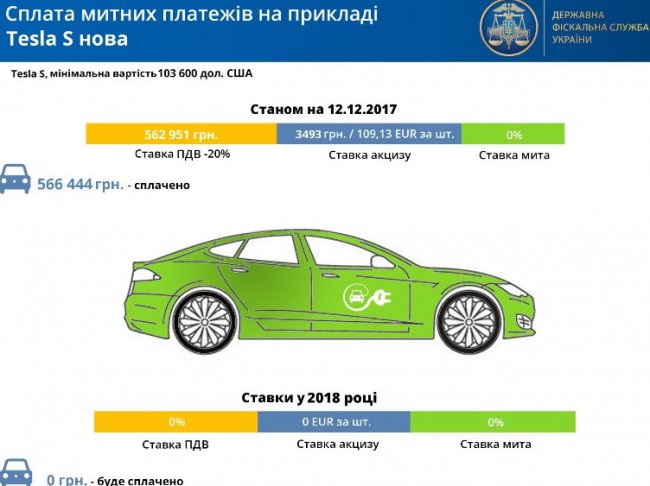 А вот с новым автомобилем Tesla Model S, минимальная таможенная стоимость которого составляет 103,6 тысяч долларов, с 1 января 2018 года экономия на отсутствии налоговых платежей при ввозе будет составлять 566,5 тысяч гривен.
