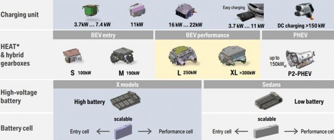 Во-первых, появится линейка унифицированных силовых агрегатов: электродвигатель, редуктор и управляющая электроника будут объединены в один блок. У самих моторов появится несколько градаций мощности: 136, 258, 340 и 408 л.с., а для гибридов — до 204 л.с.