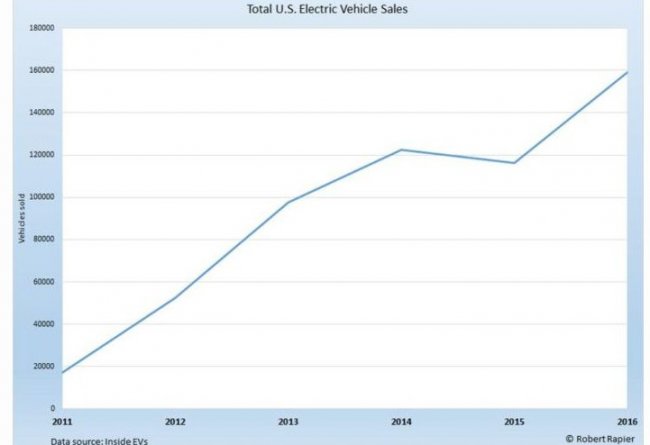 Рост продаж электромобилей в США за прошлые годы. За 3 квартала 2017 продано почти 160 000 единиц – как за целый прошлый год.