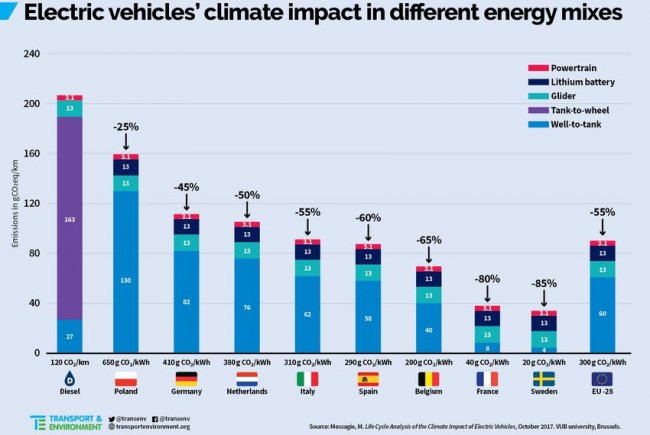Даже в странах с наибольшей интенсивностью выделения ПГ при выработке электроэнергии – в Польше и Германии – электромобили оказывают меньшее влияние на окружающую среду (включая выбросы при производстве батареи и самого транспортного средства), чем дизельные машины. Используя средний показатель по Польше, авто на электротяге на протяжении всего срока службы выделяет на 25% меньше CO2 (а в Швеции даже на 85% меньше), чем транспортное средство с ДВС.