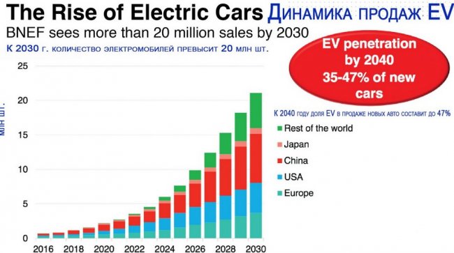 Электромобили (Electric Vehicles, EV) быстро и уверенно наступают. И это уже не просто мнение общественности – Total SA, один из крупнейших мировых производителей нефти, заявляет, что к концу следующего десятилетия доля EV в продаже новых автомобилей может превысить 30%.