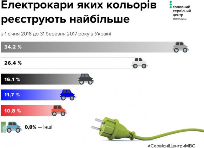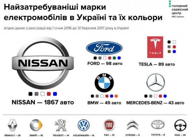 Вполне предсказуемо, самым распространённым электромобилем стал японский хэтчбек Nissan Leaf c показателем в 1867 зарегистрированных авто. Второй и третьей по популярности c большим отрывом стали марки Ford и Tesla c показателями 98 и 89 зарегистрированных машин соответственно. При этом самым востребованным цветом электрокаров и гибридов в Украине стал серый.