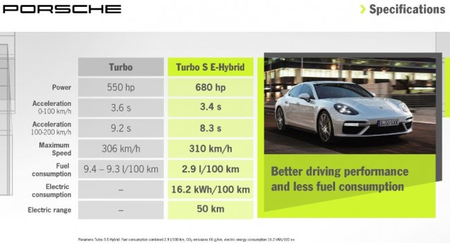 На чисто электрической тяге Porsche Panamera Turbo S за счёт 14,1-киловаттного литий-ионного аккумулятора сможет проехать 50 километров. Цифра выглядит небольшой, однако такой дальности вполне хватит для большинства рутинных ежедневных поездок по городу. До 100 км/ч гибрид разгоняется за 3,4 секунды, а максимальная его скорость составляет 309 км/ч.