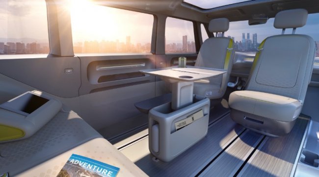 Микробус «Айди Базз» оснастили тремя рядами сидений. В режиме автопилотирования передние кресла можно развернуть против направления движения, при желании кресла второго ряда превратить в столы, а сиденья третьего разложить в кровать.