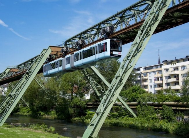 Как следует из названия, главное отличие монорельсовой дороги – наличие не двух, а одного рельса. По способу передвижения вагонов по рельсу эта система может быть опорной или подвесной. Именно последняя используется в Вуппертале. Ее общая длина составляет 13 километров, 10 из которых проложены над рекой. Состав приводится в движение с помощью электрического привода. По оценкам экспертов, около 85 000 пассажиров используют ее каждый день.