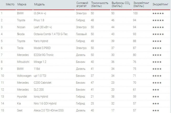 Самым «зеленым» среди всех авто оказался обновленный городской хэтчбек BMW i3 (94 Ач), который поступил в продажу в этом году (напомним, основное отличие от предшественника – увеличенный до 300 км запас хода (NEDC). Второе место в списке заняла гибридная Toyota Prius. Также в рейтинг попали еще два электрокара – Nissan Leaf (30 кВтч) и Tesla Model S P90D – они разместились на третей и шестой позициях соответственно.