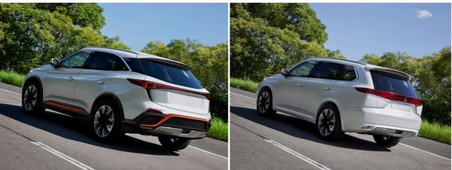 Но, как выяснили внимательные журналисты издания Elektrek, эти изображения не являются фотографиями, более того, они даже не являются эскизами: это лишь грубая ретушь снимков других производителей, наспех сделанная в Photoshop. В частности, кроссовер Weltmeister нарисован поверх фирменного снимка Mitsubishi Outlander PHEV. В пользу этого факта говорит тот факт, что изображения сделаны с одного ракурса, в них одинаковый фон, одинаковая окраска кузова автомобилей. Китайцы не парились даже изменить колесные диски и алюминиевую имитацию диффузора в заднем бампере.