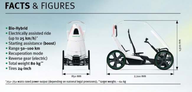 Транспортное средство получило название bio hybrid (био-гибрид). И действительно, оно сочетает в себе достоинства велосипеда и автомобиля, предоставляя пользователю возможность путешествовать с комфортом, бережно относится к экологии и не забывать о своем здоровье.