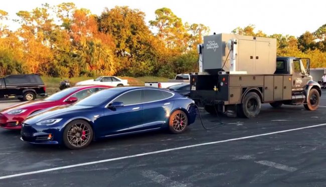 Для зарядки «Теслы» на трек доставили промышленный генератор. Ранее автомобиль был вынужден ездить для восполнения запаса батарей за несколько километров от места гонок, теряя по дороге часть энергии.