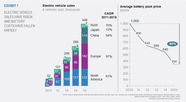 Стоимость литий-ионных аккумуляторов в 2015 году снизилась на 65% — до $350 за кВт∙ч — и, как ожидается, до 2025 года снизится до $100 за кВт∙ч. По оценке BNEF, к 2040 электрокары и гибридные автомобили сократят спрос на нефть, вытеснив добычу 13 млн баррелей в сутки.