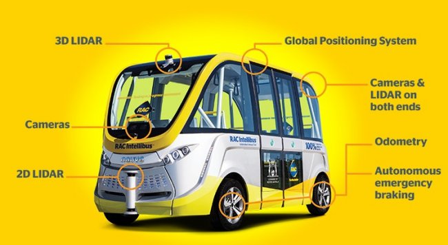 «Умный» автобус под названием RAC Intellibus вмещает 11 пассажиров, его максимальная скорость составляет 45 км/ч. Транспортное средство оснащено полностью электрическим приводом, комплексом лидаров и системой стереокамер, которые позволят ему распознавать знаки дорожного движения, а также «видеть» и объезжать помехи, возникающие на дороге.