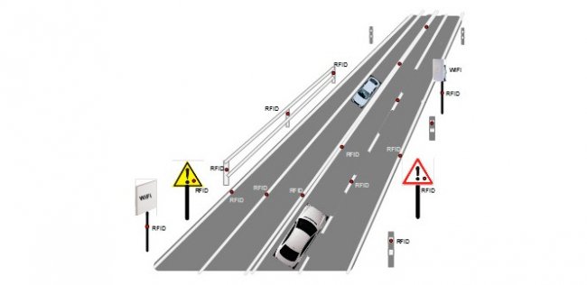 Собственно для развития этой самой инфраструктуры в «Инфокоме» придумали концепт умных дорог или Smart Roads. Ее призвание — способствовать повышению безопасности движения автопилотируемого транспорта и развитие дорожной инфраструктуры в целом. «Умная дорога — это физическая идентификация дорожных знаков, дорог, улиц, направлений с помощью пассивных/активных радиочастотных RFID-меток, устанавливаемых на дорожной разметке, светоотражателях, бордюрах, дорожных знаках, ограждениях, отбойниках и т.п.», — пояснили разработчики.