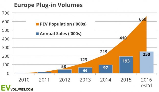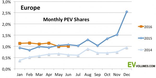 За первые 6 месяцев 2016 года в Европе было продано в общей сложности 91 300 подключаемых электрических транспортных средств, при этом прирост относительно того же периода предыдущего года составил 21%. Такие цифры приводит аналитический ресурс EV Volumes.